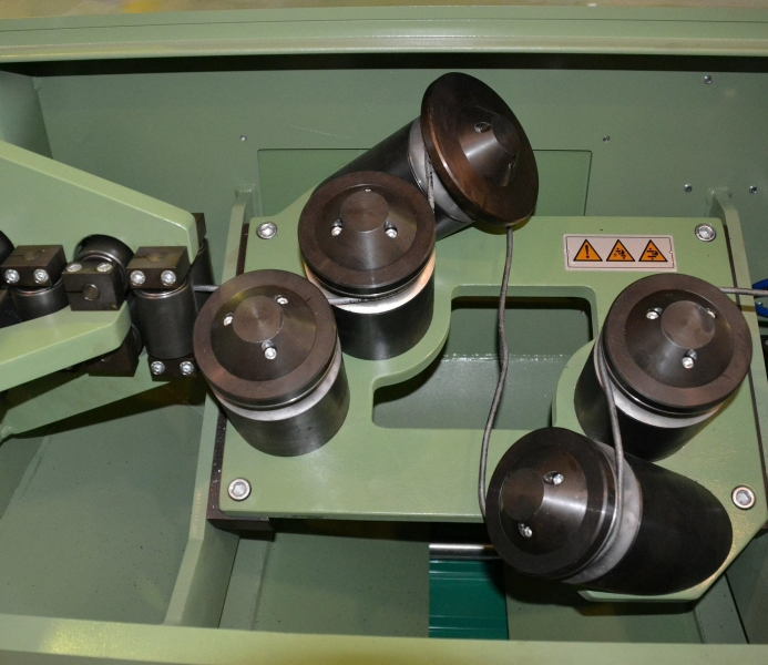 - Rulli in carburo di tungsteno integrale rompono la calamina tramite piegamenti alternati della vergella. Il circuito di piegamento può essere fisso su quattro piani ortogonali o aggiustabile tramite regolazione idraulica dei rulli centrali. L’ingresso e l’uscita del circuito di piegamento sono coassiali per un facile infilaggio della vergella.